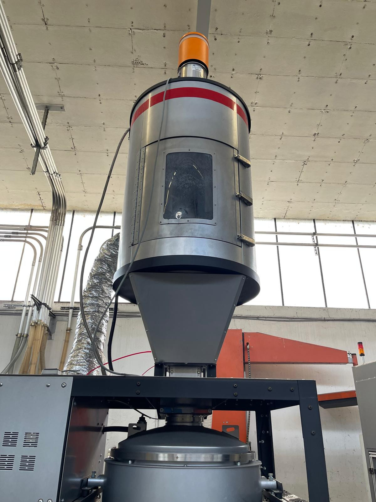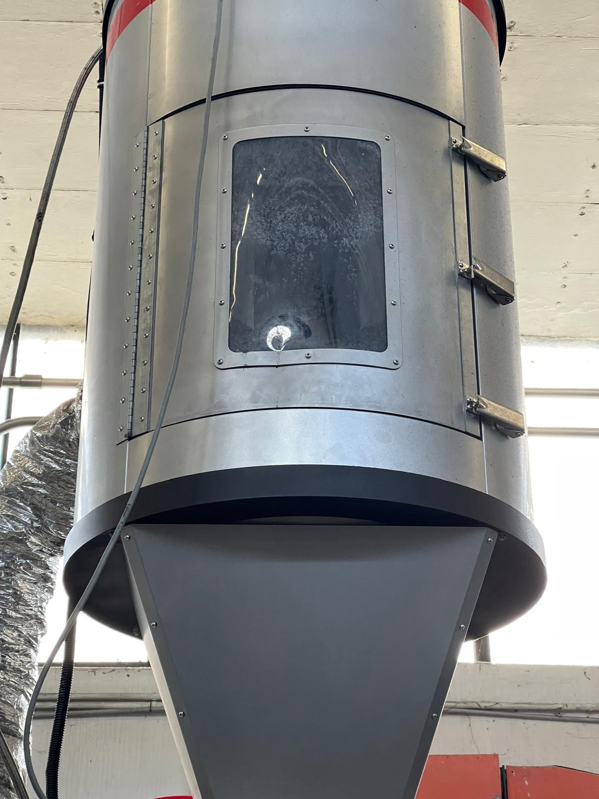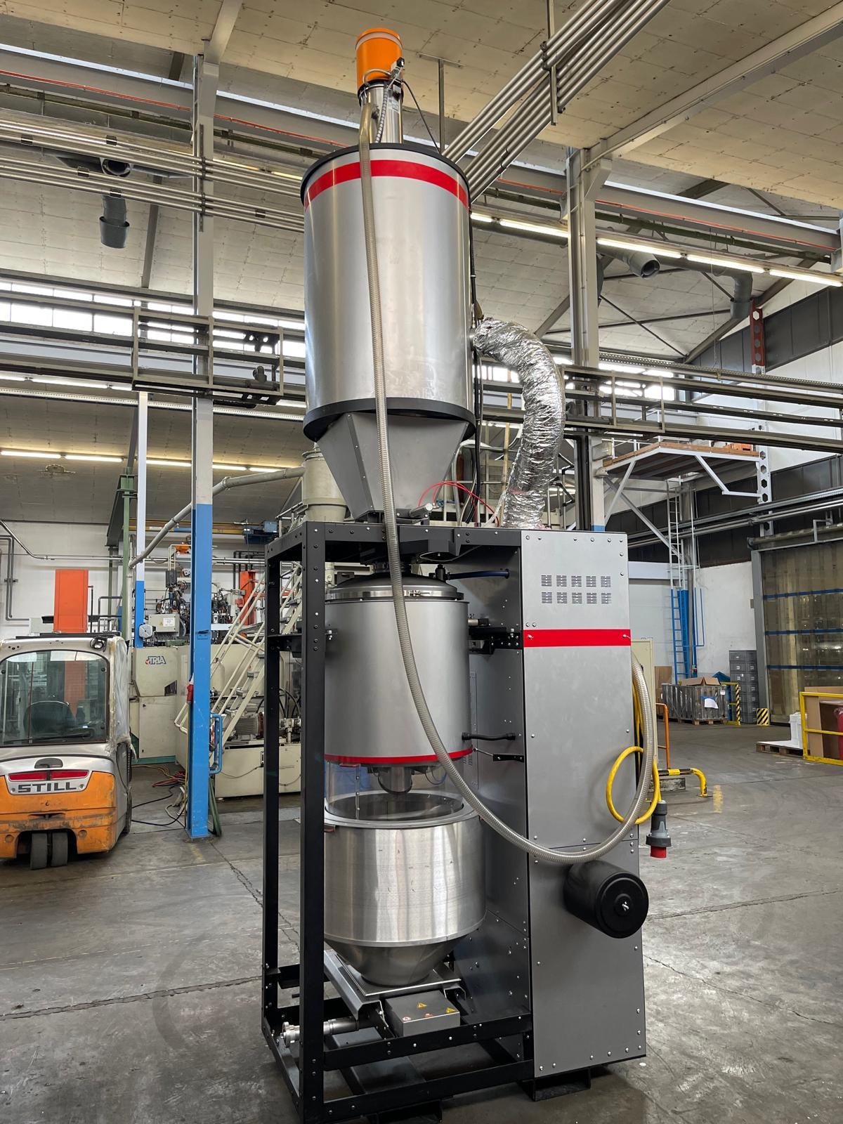 Vakuum- und Buffertrichter druckbeaufschlagt mitTrockenluft bei -40° Taupunkt. vertikales Design mit minimaler Bodenstellfläche.minimaler Wärmeverlust durch Doppelisolierung allerBehälter.